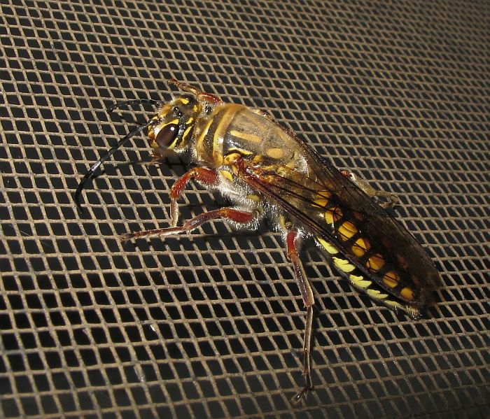 The male thynnine wasps are attracted to the females when she releases a pheromone to indicate she is ready to mate. It is interesting to note that many plants, particularly orchids mimic this pheromone to attract the male wasp, who inadvertently pollinates them when they grasp the labellum, which they think is the female. However most of these wasps would be much smaller than this species (probably a Hemithynnus sp.) that is over 3 cm (11/4”) in length (excluding antennae), so a little large for most orchid flowers. The wingless female above (which may not be the same species) is about a third the size of the male.
